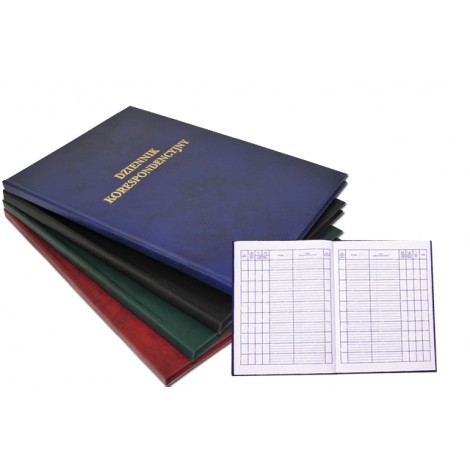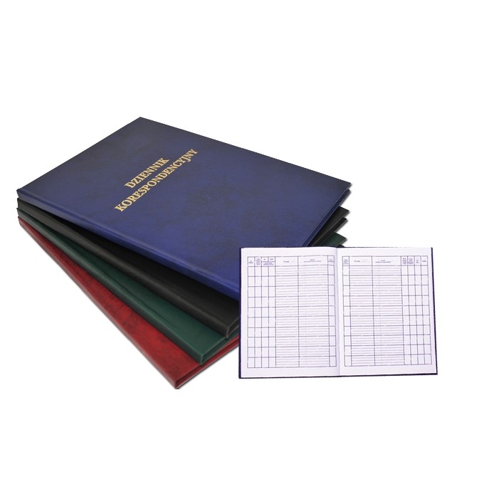 Okładka tekturowa sztywna oklejona tworzywem skóropodobnym w czterech kolorach: granatowym, bordowym, zielonym i czarnym. Dziennik do ewidencji korespondencji przychodzącej i wychodzącej (dziennik podawczy). Dostępny w wersji 96, pakowane po 10 szt. 192 kartki i 300 kartek, pakowane po 5 szt. Format A-4.