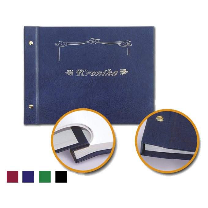 Elegancka oprawa introligatorska. Wewnątrz 100 białych kartek dzielonych specjalnymi przekładkami umożliwiającymi wklejanie zdjęć. Na pionowym lub poziomym boku ozdobne złote nity. Nitowana wzdłuż krótszego(pozioma) lub dłuższego(pionowa) brzegu. Dostępna w 4 kolorach: granat, bordo, zieleń, czerń. Format A4 oraz A3. Pakowane pojedynczo.