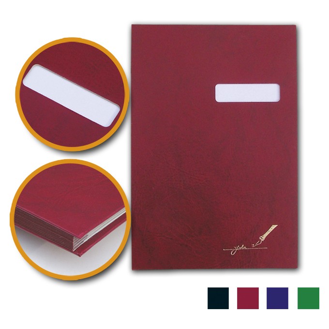 Teczka wykonana z kartonu pokrytego skóropodobnym tworzywem. Grzbiet teczki wykonany harmonijkowo. Kartki wewnętrzne kartonowe białe z dziurkami w celu pokazania zawartości teczki. Tworzywo skóropodobne w kolorach: czarnym, bordowym, granatowym i zielonym. Teczka wykonana w wersji 8, 10, 12, 16, 20 kartek. Na okładce znajduje się okienko umożliwiające opis zawartości teczki. Pakowane po 5 szt.